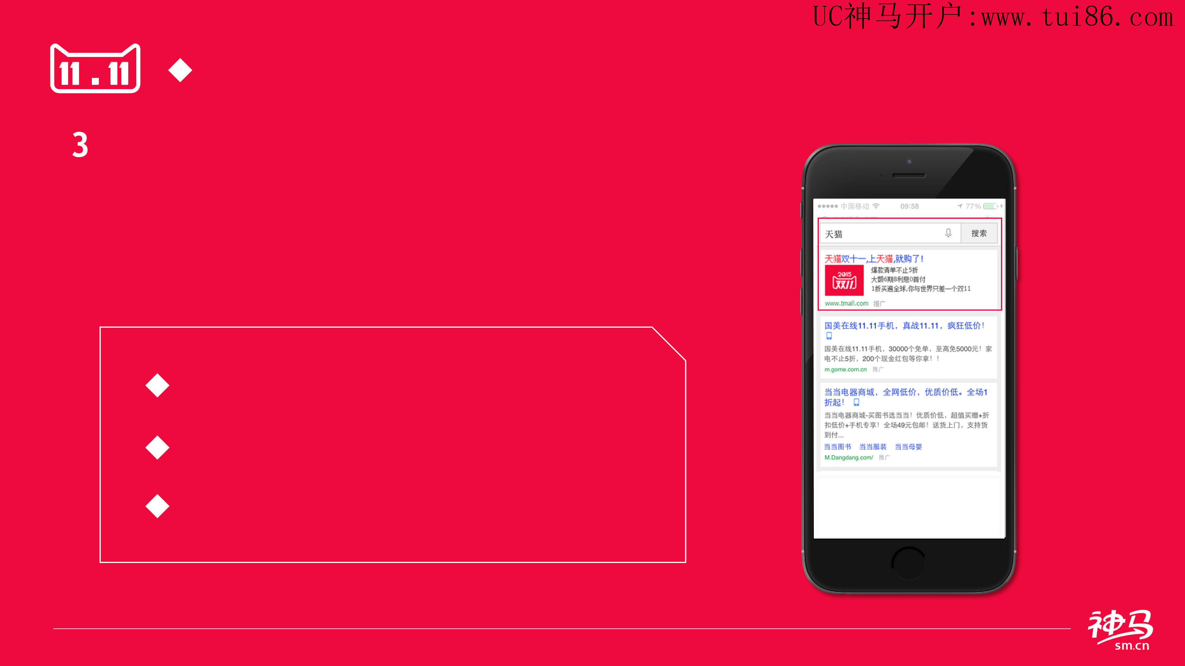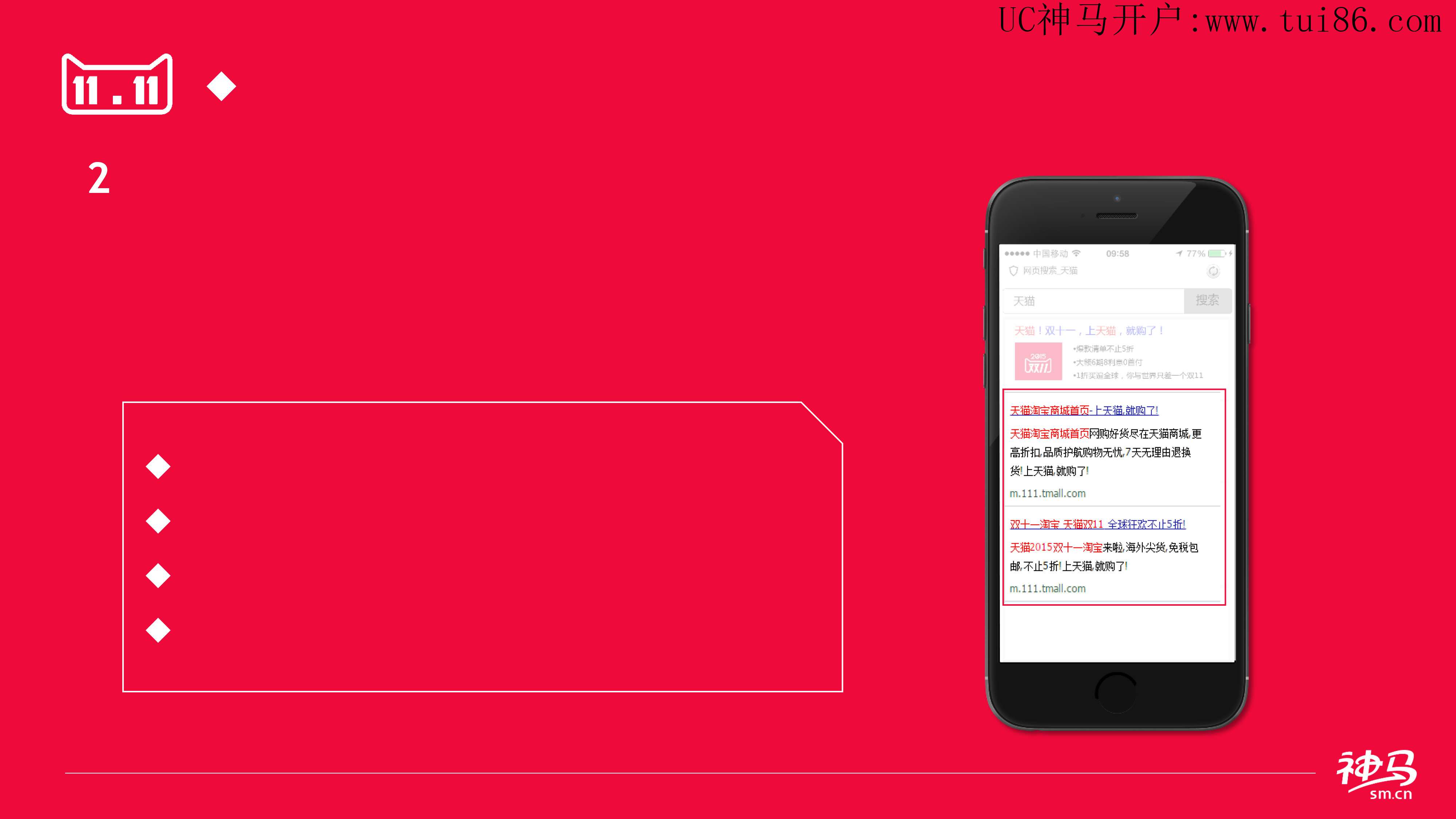點睛之筆 豐富的樣式,建立視覺焦點運用了圖文、變紅、居首等樣式的組合,構成了新穎的視覺 效果,形成了手機屏幕的視覺焦點,極大促進了關注和點擊 圖文結合:圖片與文字相互輝映.突出主題標題標紅:標紅合理飄紅,吸引網民目光 占據首位:特殊樣式占據首位.引導流量