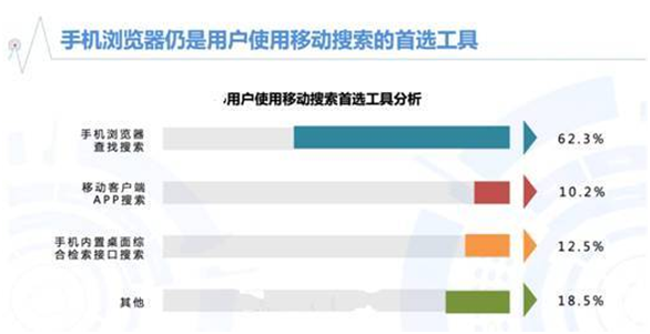 報告指出,我國手機網民規模逐步增加, 移動搜索用戶在手機網民中的滲透率達88.5%,在各類手機應用使用率中位列第二,僅次于移動通訊社交,并成為了移動廣告主渠道。報告同時指出,在用戶使用移動搜索工具方面,手機瀏覽器仍是主流,占比為62.3%。而在中國第三方手機瀏覽器活躍用戶分布方面,UC手機瀏覽器排名,占比56.2%;QQ手機瀏覽器、百度手機瀏覽器分列二、三位,分別占比36.1%和17.4%,神馬和搜狗分別是UC瀏覽器和QQ瀏覽器的默認搜索引擎。