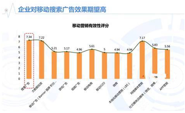 與此同時,報告還指出,隨著用戶行為全面向移動端轉移,移動營銷將成為企業推廣的重要渠道,而移動搜索已經成為了移動廣告的主渠道。數據顯示,在移動營銷有效性方面,移動搜索廣告以7.34的評分排名首位,足見企業對于移動搜索廣告效果的期望之高。而在企業選擇各類移動營銷推廣方式中,移動搜索營銷推廣占比32.1%,這意味著,已有逾三成企業會優先選擇移動搜索推廣。