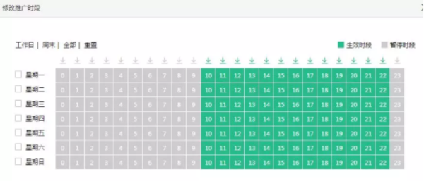 時(shí)段:無(wú)線流量高峰期在19:00-23:00,除了9:00-18:00正常投放外,晚上也必須上線推廣,在流量高峰期獲取更多的流量和效果。