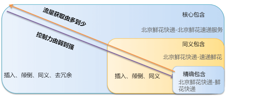 一共有5種匹配模式可供您選擇,分別為:匹配、短語匹配(分為核心包含、同義包含、包含)、廣泛匹配。