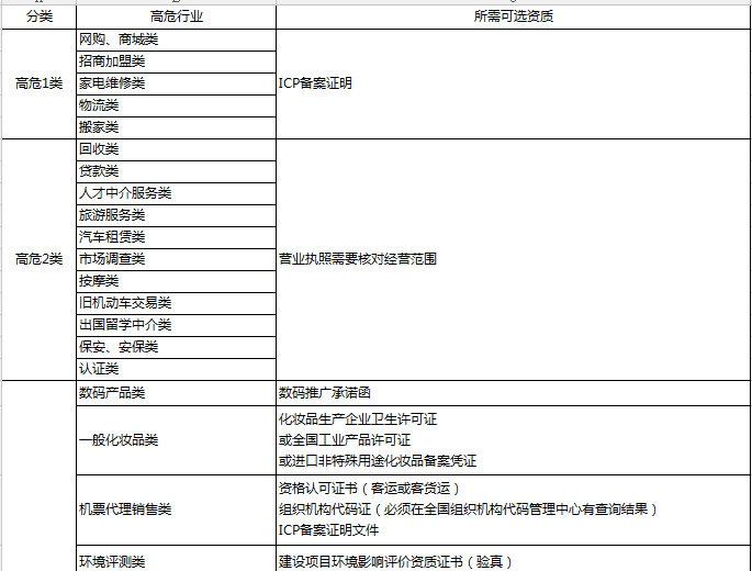 答: 分類高危行業(yè)所需可選資質(zhì)高危1類網(wǎng)購、商城類ICP備案證明家電維修類 物流類 搬家類 招商加盟類 高危2類回收類營業(yè)執(zhí)照需要核對經(jīng)營范圍貸款類 人才中介服務(wù)類 旅游服務(wù)類 汽車租賃類 市場調(diào)查類 按摩類 舊機動車交易類 出國留學(xué)中介類 保安...